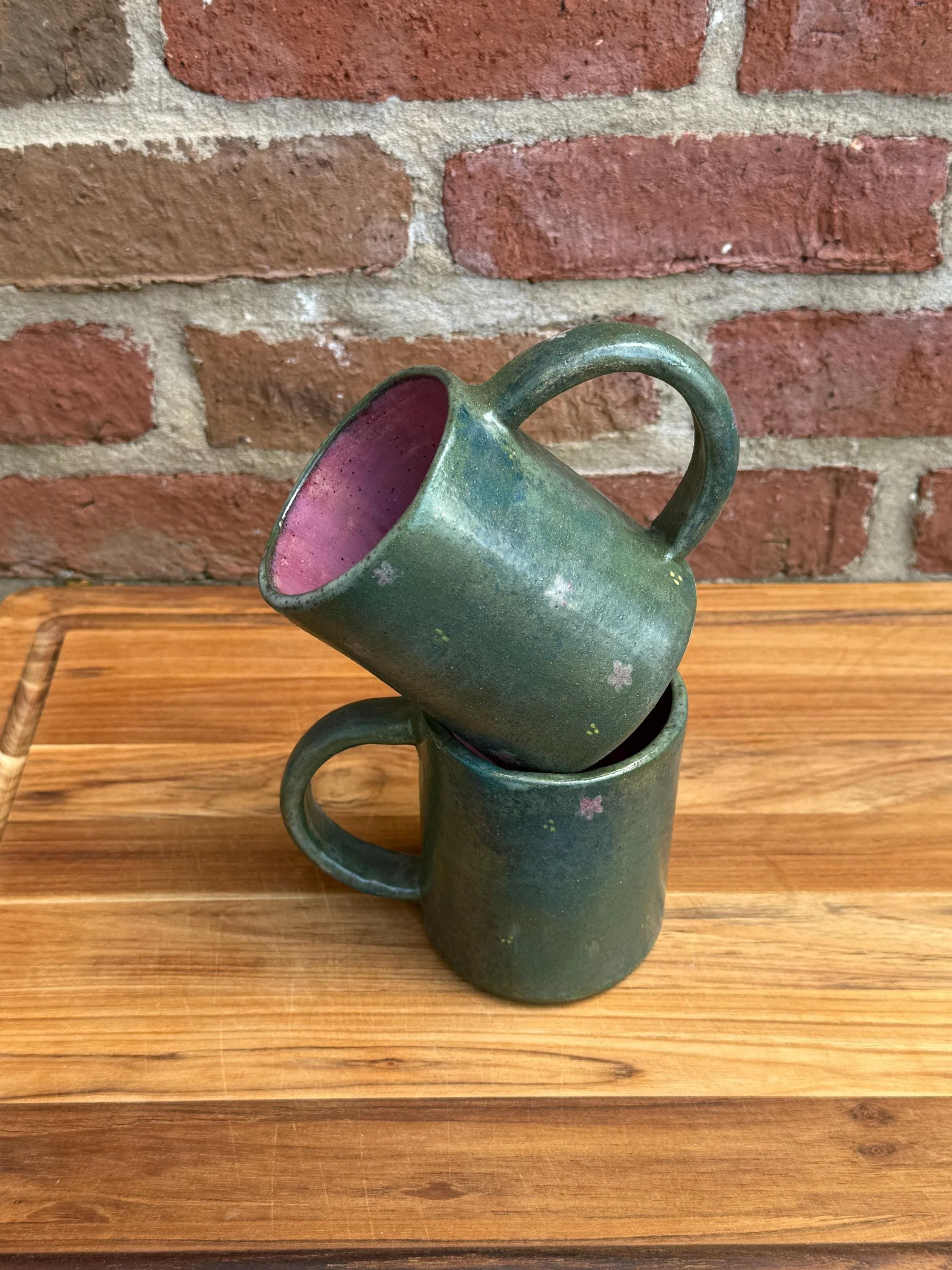 Think Monet, but with a wink. This hand-built mug brings garden-daydream energy to your morning coffee, with a painterly green glaze scattered with tiny blooms—like water lilies drifting across a pond. Peek inside and you’ll find a pop of vibrant pink, a playful surprise that feels like sipping straight from a flower.